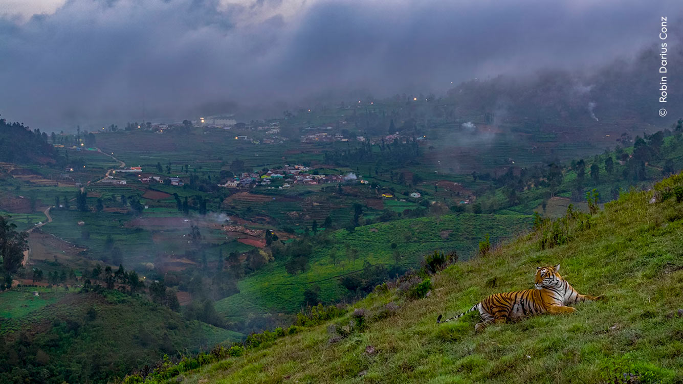 Робин Дариус Конц наблюдал за тигром на склоне холма на фоне города, где когда-то росли леса. Робин следовал за этим тигром в составе документальной группы, снимавшей дикую природу Западных Гат. В этот день он использовал дрон, чтобы наблюдать, как тигр исследует свою территорию, прежде чем поселиться в этом месте. (Фото © Robin Darius Conz / Wildlife Photographer of the Year):