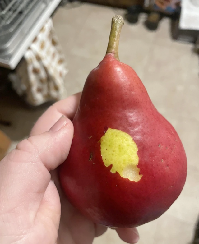 «Купила груш. Отколупала с одной наклейку, а под ней обнаружилось это. Зеленая кожура, а не красная»