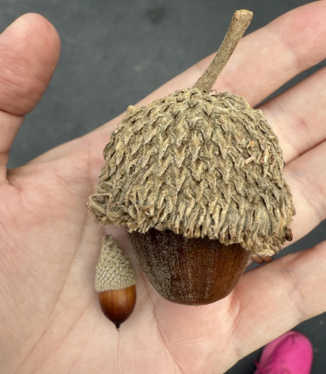 «Сегодня во время прогулки мы нашли огромные желуди (для сравнения — обычный желудь)»