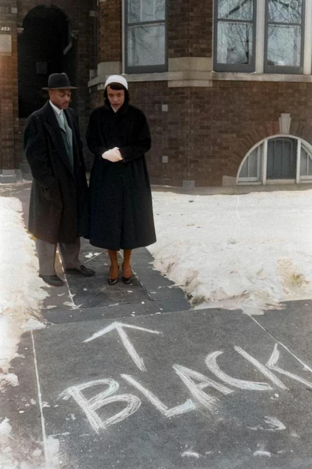 Черная пара, недавно переехавшая в "белый" район, смотрит на расистскую надпись перед их домом. Чикаго, США, 1957 год.