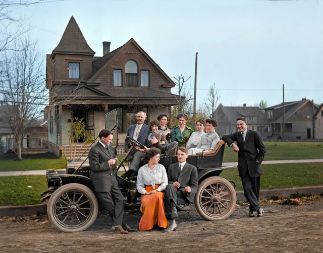 Семья позирует рядом с автомобилем в Спокане, штат Вашингтон, 1913 год.