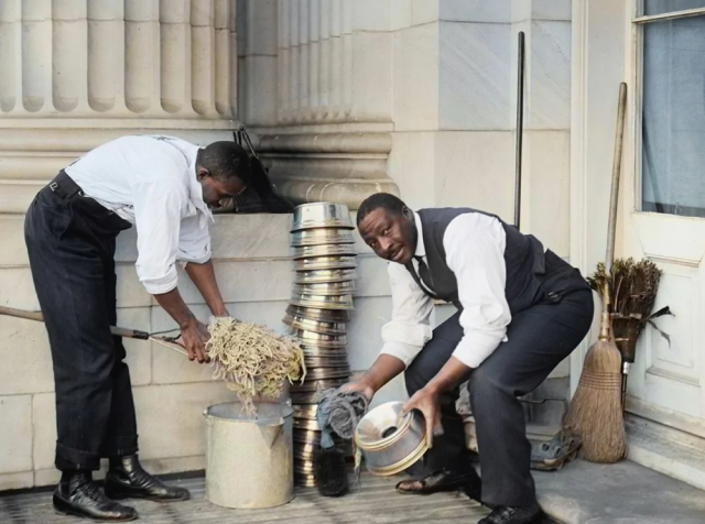 На фотографии 1914 года изображены двое афроамериканцев, работающих в Капитолии США. У одного слева швабра и ведро, у другого справа - стопка плевательниц и щетка для уборки. Справа - две метлы и щетка для чистки ковров.