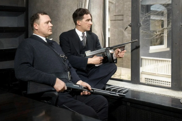 Полицейские охраняют здание суда во время процесса над знаменитым грабителем банков Джоном Диллинджером, 30 января 1934 года.