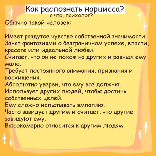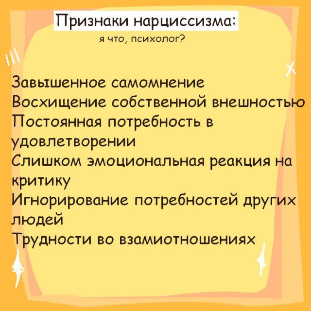 Нарциссизм: объяснение термина 09/12/2024 21:40 Вы, возможно, часто слышали слово "нарцисс", но что оно на самом деле означает? Откройте карточки и узнайте, что скрывается за этим понятием. Главная / Картинки +3 Admin 0 118