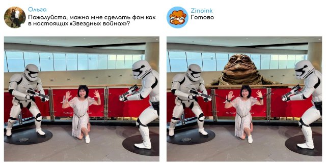 Смешной фотошоп от Zinoink 20/12/2024 21:00 Пора немного отдохнуть и посмеяться! Встречайте новую коллекцию забавных фотошопных работ от мастера Zinoink. Он снова удивил своих подписчиков неожиданными и остроумными редактированиями снимков. Давайте взглянем на его свежие творения! Главная / Картинки +1 Admin 0 119