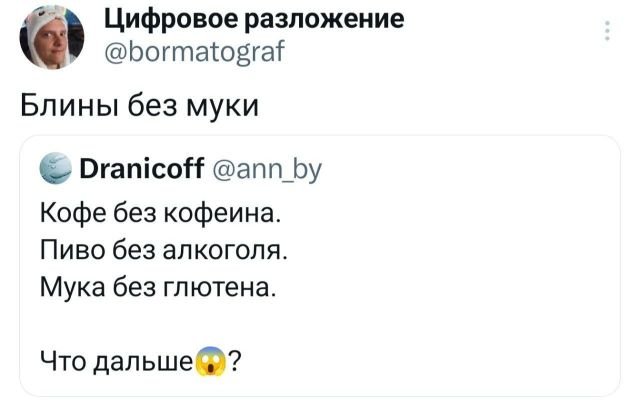 Веселые твиты для поднятия настроения 20/12/2024 22:00 Представляем вам свежую подборку забавных твитов. Идеальный способ сделать паузу и поднять себе настроение. Не упустите шанс посмеяться вместе с нами – давайте заглянем, какие перлы сегодня оставили пользователи соцсетей. Главная / Картинки 0 Admin 0 170