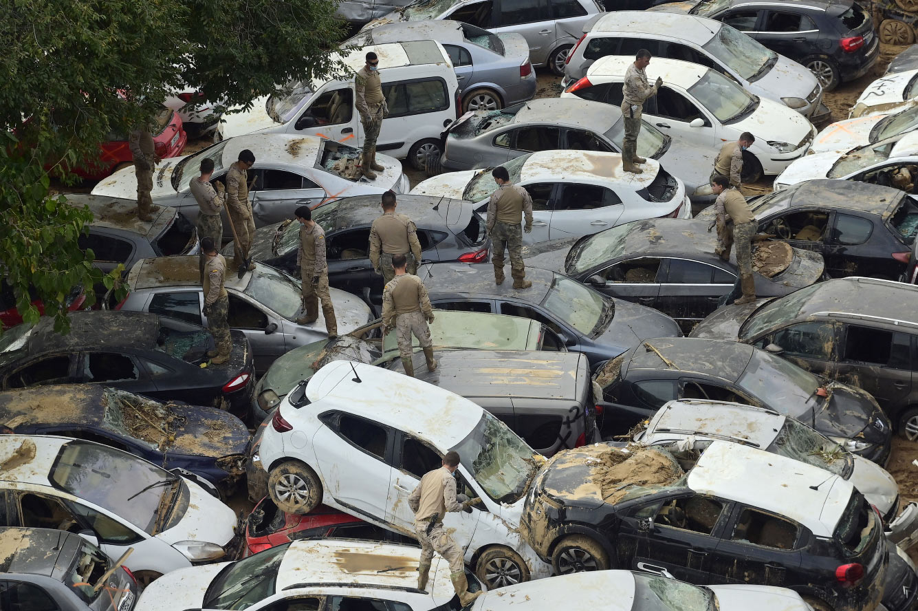 Разбитые автомобили, поврежденные наводнением в Массассане, регион Валенсия, восточная Испания. Самые сильные наводнения в европейской стране за поколение унесли жизни более 210 человек, десятки людей пропали без вести и затопили целые города в грязи, особенно в восточном регионе Валенсия. (Фото Jose Jordan):