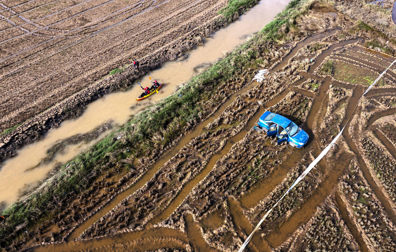 Бойцы V батальона военного подразделения по чрезвычайным ситуациям UME используют каноэ для поиска тел, смытых наводнением на окраине Валенсии, Испания. (Фото Emilio Morenatti):