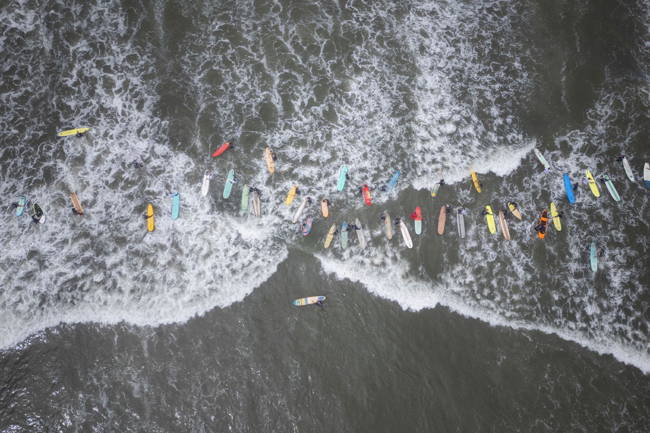 Фотография серферов, пытающихся обуздать одну и ту же волну, чтобы побить мировой рекорд Гиннесса, сделанная с дрона в Сантосе, Бразилия. (Фото Reuters)):