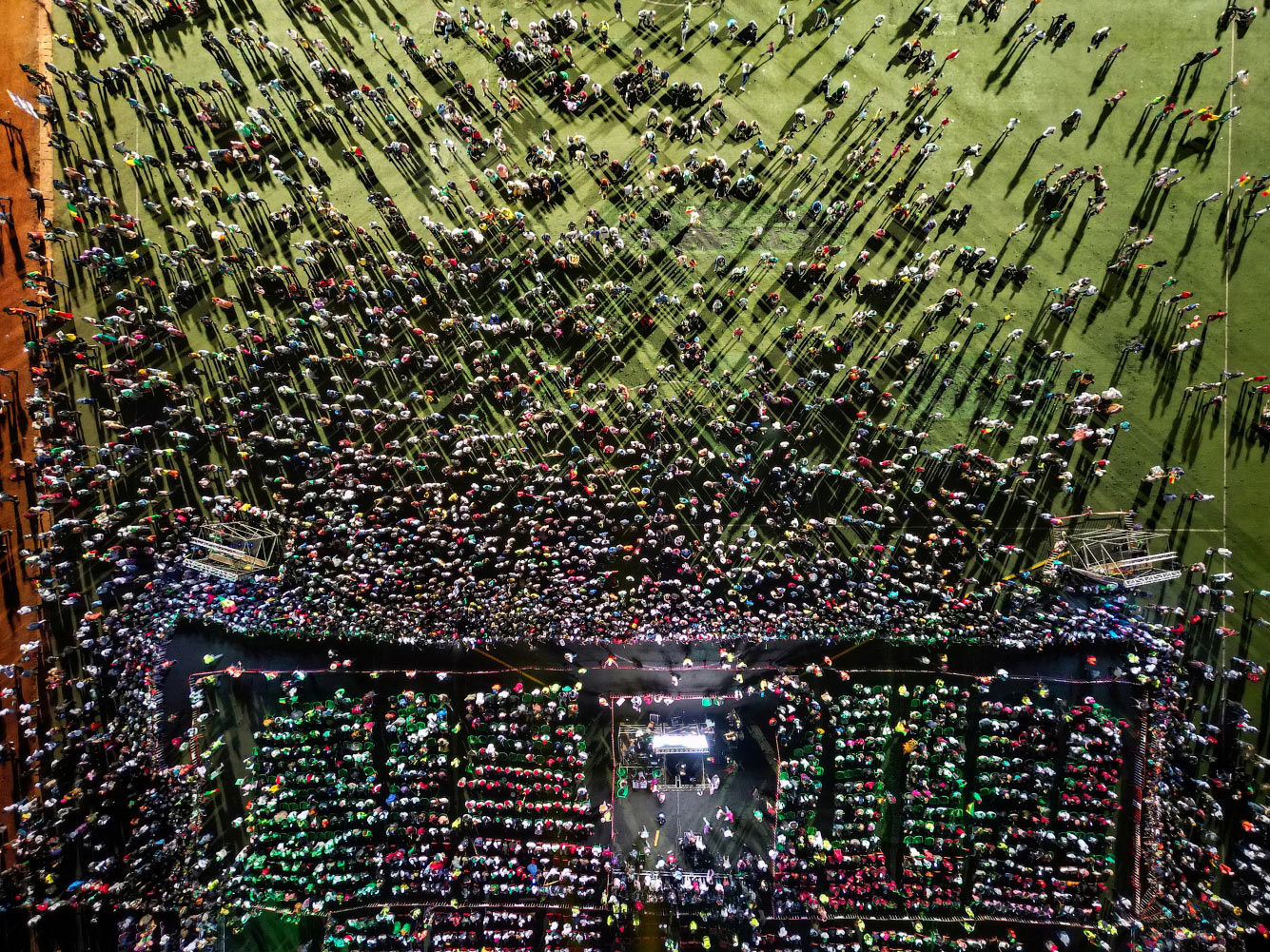 На снимке с беспилотника показаны сторонники премьер-министра Сенегала и главы правящей партии Пастефа Усмана Сонко, принимающие участие в предвыборном митинге по предстоящим досрочным выборам в законодательные органы в Гедиавайе на окраине Дакара, Сенегал. (Фото Zohra Bensemra):