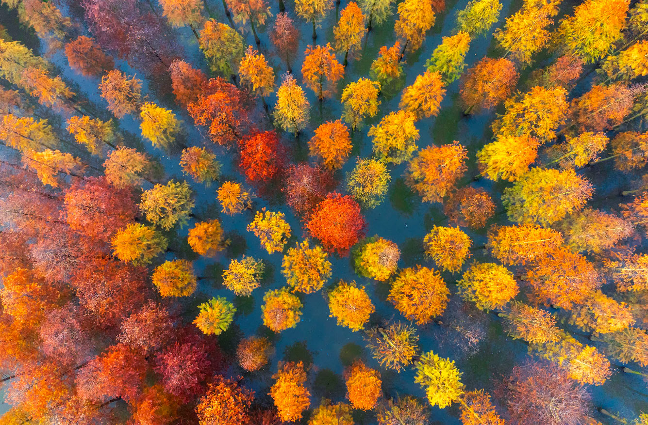 Аэрофотоснимок красочного леса метасеквойи в живописном водно-болотном угодье озера Хунцзе в Суцяне, провинция Цзянсу на востоке Китая. (Фото CFOTO):