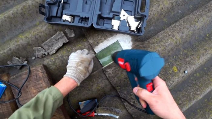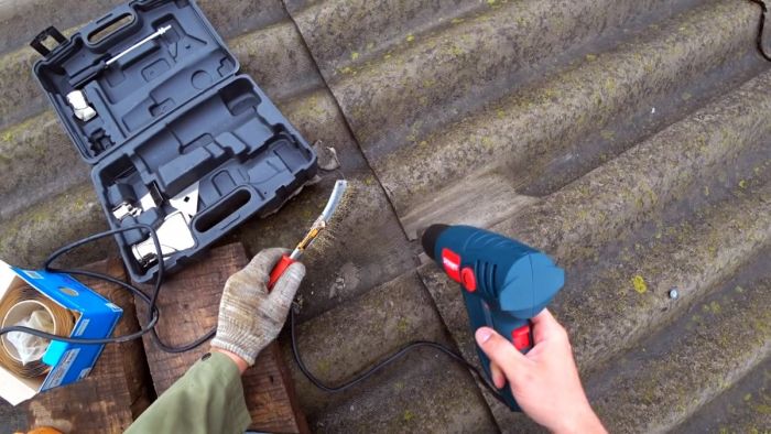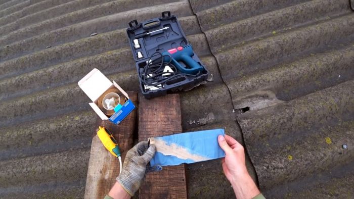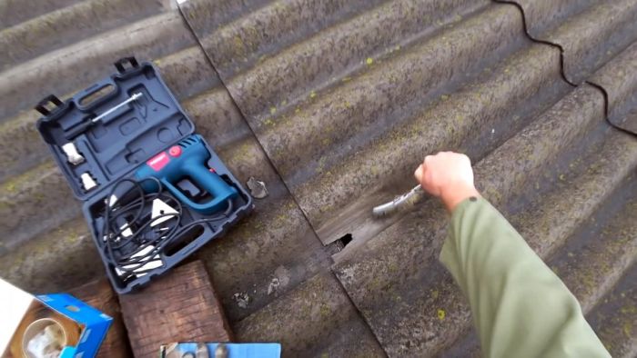 Первым делом нужно проложить удлинитель к месту ремонта, чтобы подключить монтажный фен. Важно передвигаться по шиферу с предельной аккуратностью, чтобы его не расколоть, так как трещины через весь лист лентой не отремонтируешь. Лучше всего положить на крышу доску, и передвигаться по ней. Важно не наступать на края и особенно углы листов, так как в этом месте они очень хрупкие.
