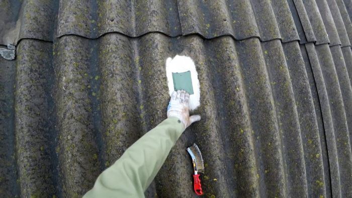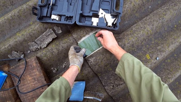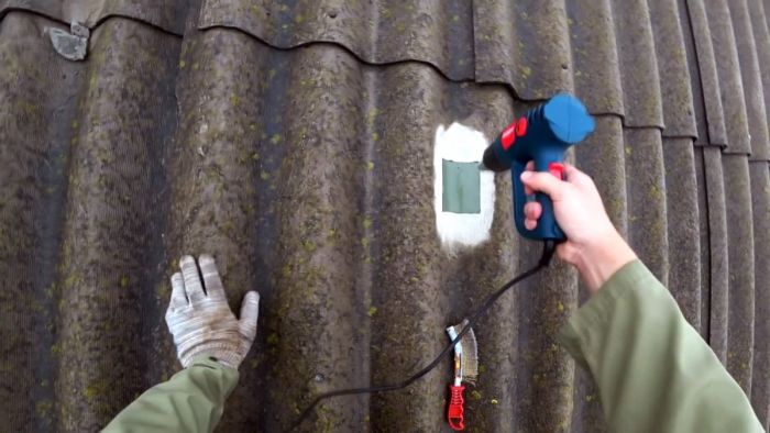 Если шифер мокрый, то его обязательно следует просушить по зачищенному месту, пока он не посветлеет.