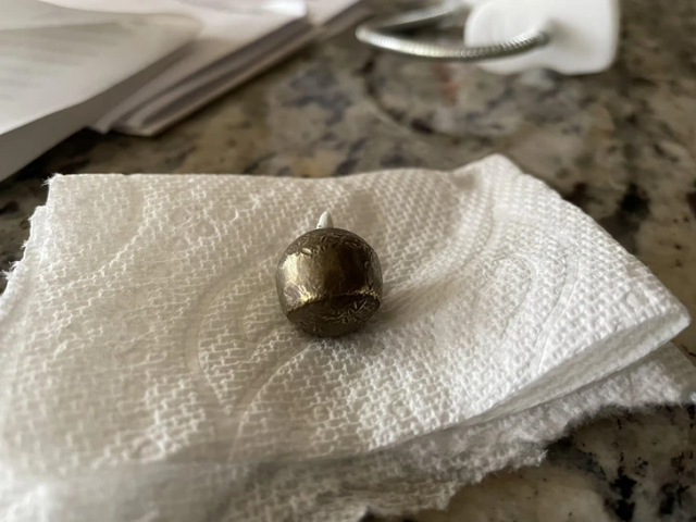«Нашел этот шарик у своего сына-подростка. Думает, что кто-то из друзей подложил ему это в карман. Шар металлический, внутри какой-то белый кусочек из воска»