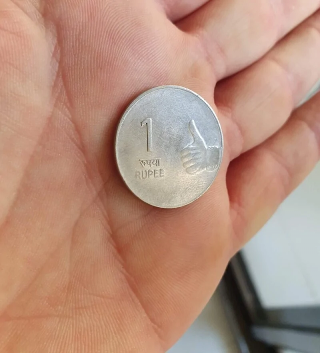 На индийской монете в 1 рупию есть только рука, которая показывает большой палец