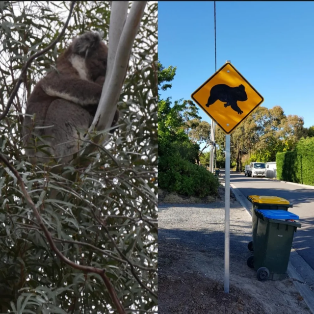Коала, которая поселилась в саду у моего друга, и новый знак, который муниципалитет установил, чтобы позволить зверьку безопасно пересечь обычную улицу в Австралии
