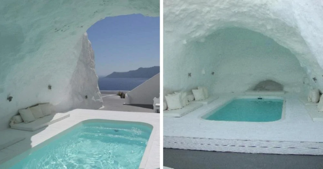 Бассейн гостиницы Katikies Hotels, находящийся прямо в скалах, Греция