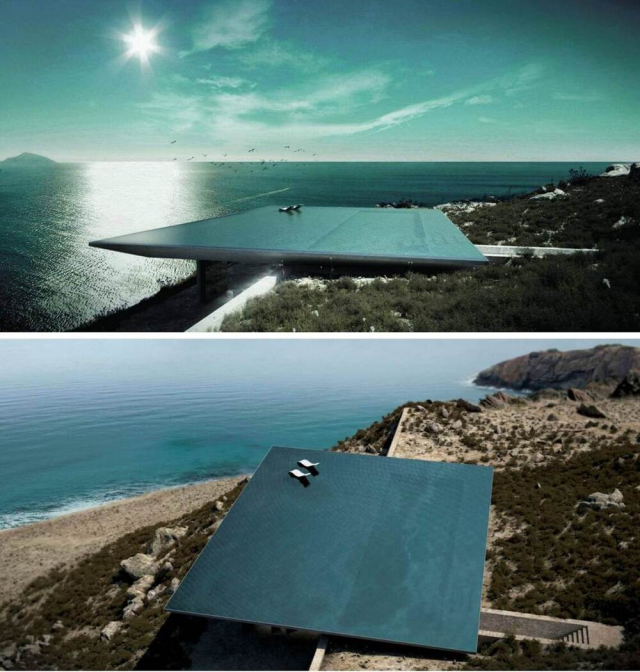 Необычный дом интегрирован в скалистое побережье таким образом, что единственной видимой его частью остаётся открытый бассейн. Издалека он напоминает продолжение гладкой морской поверхности.