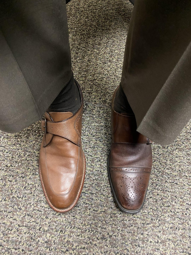 «Надел их сегодня утром, чтобы узнать мнение жены. Забыл переобуться перед уходом и весь день был на работе в таком виде»