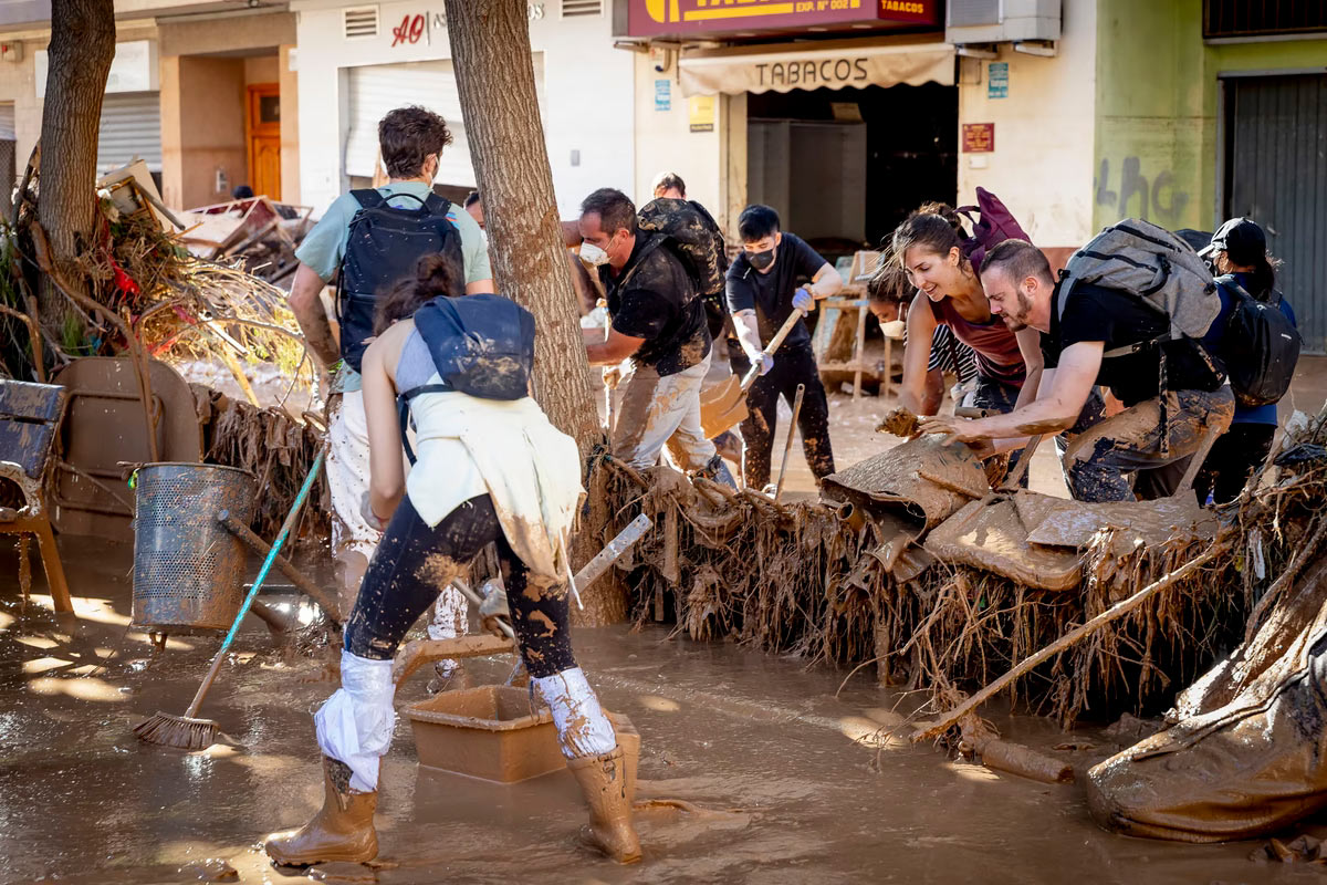 Волонтеры расчищают завалы на улице в Валенсии, пострадавшей от наводнения. (Фото Albert Llop):