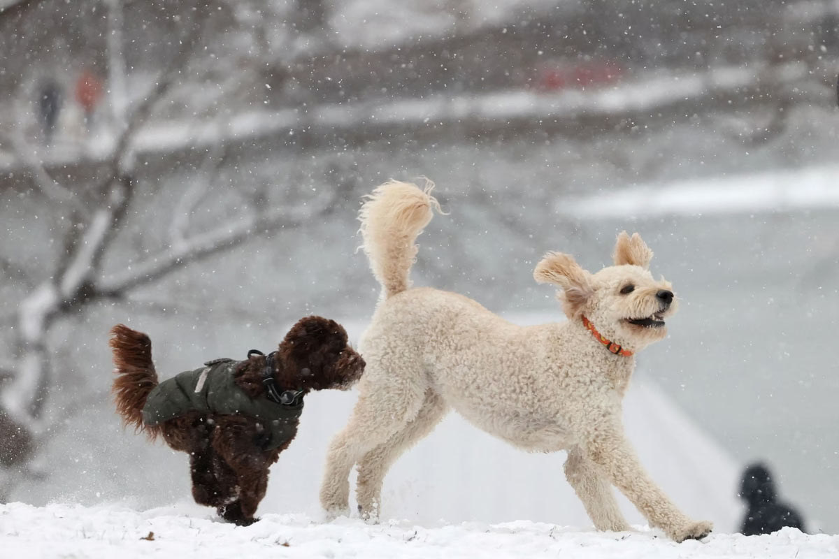 Собаки играют в Центральном парке во время первого снегопада за более чем 700 дней в Манхэттене, Нью-Йорк. (Фото Andrew Kelly):