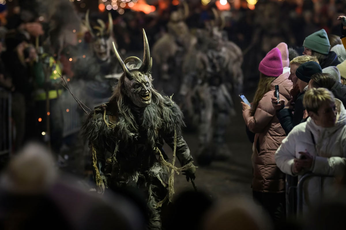 Традиционно мужчины наряжаются в наряд Крампуса в первую неделю декабря, а особенно в ночь с 5 (День Крампуса) на 6 декабря (День Св. Николая) и бродят по улицам, пугая детей цепями и колокольчиками. (Фото Denes Erdos):