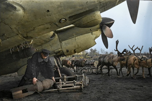 Подвеска авиабомб ФАБ-100 на пикирующий бомбардировщик Пе-2 ВВС Северного флота, 1942 год.