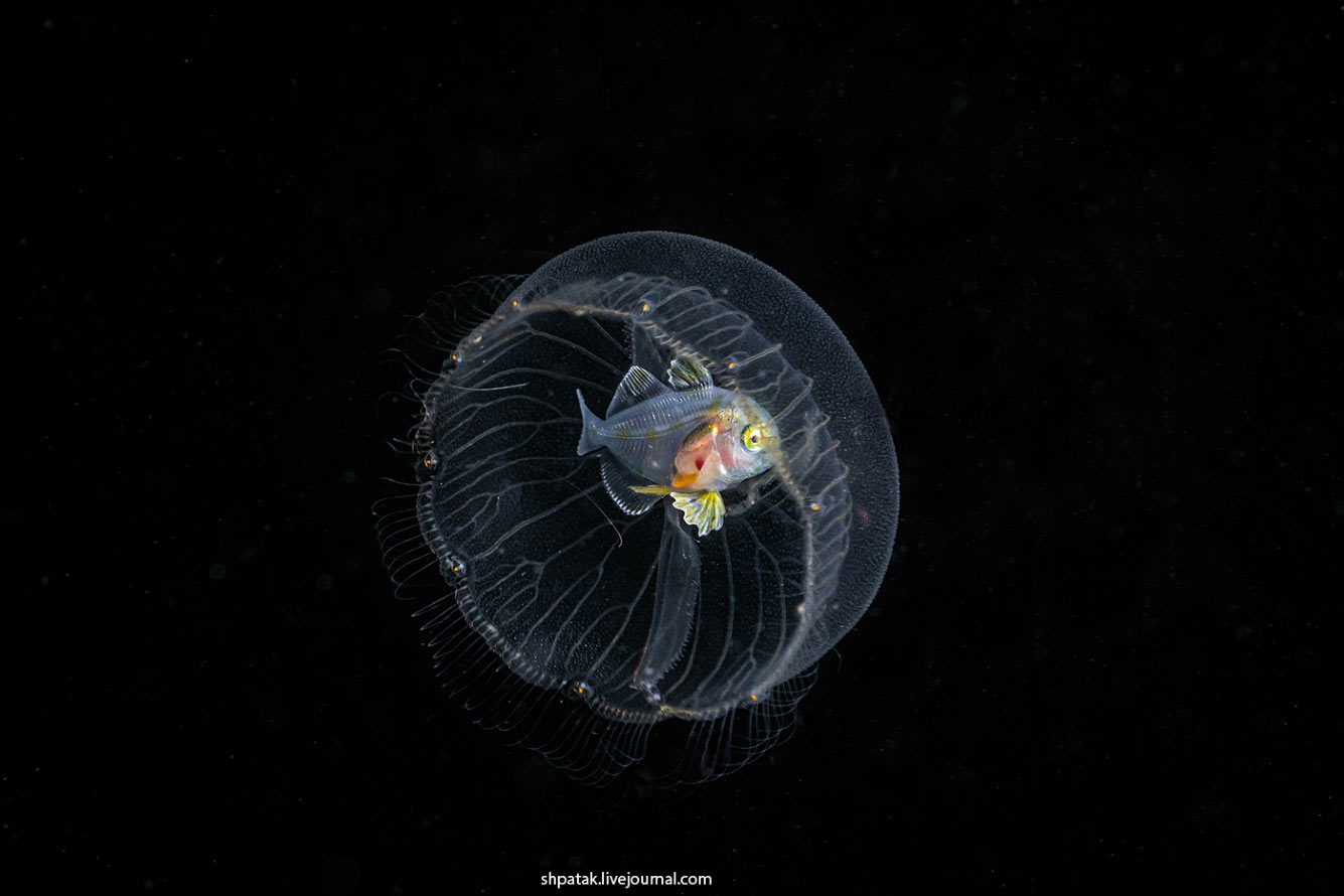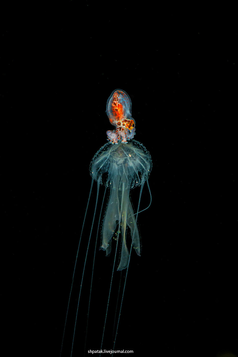 Самец осьминога Аргонавта(длин 20 мм) верхом на медузе: