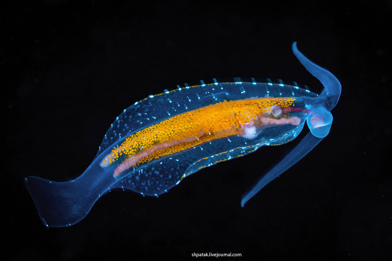 Пелагический голожаберный моллюск Phylleroe bucephala. Длина 40 мм: