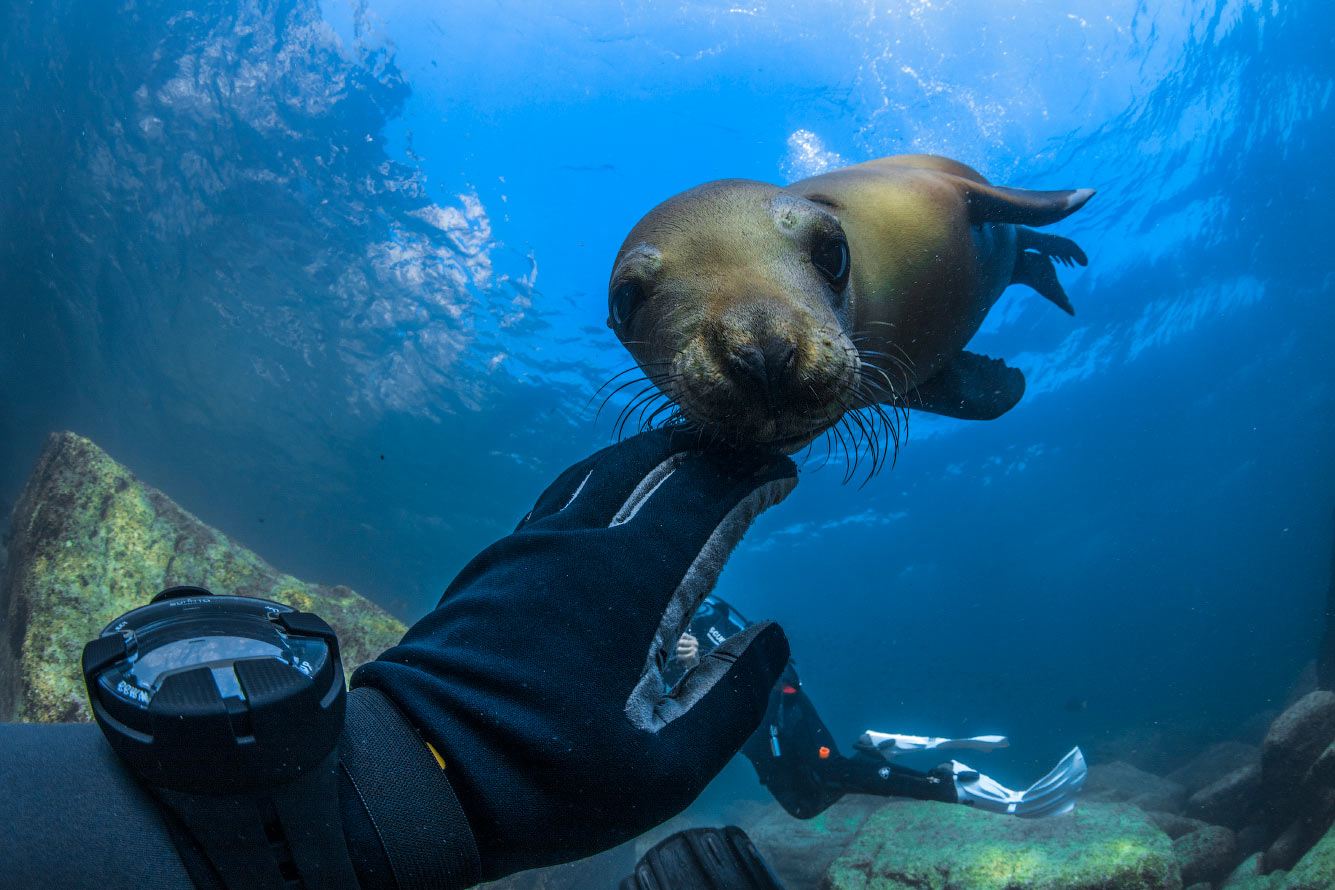 Детеныш морского льва приветствует Герберта Футтеркнехта у побережья острова Лос-Ислотес в Мексике. (Фото Herbert Futterknecht):