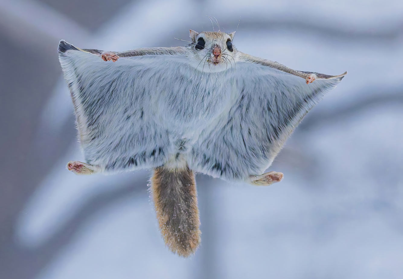 Белка-летяга скользит по воздуху. Внешне похожа на небольшую короткоухую белку, но между передними и задними лапами у неё имеется широкая кожная складка, покрытая шерстью — летательная перепонка, играющая роль несущей поверхности при прыжках. (Фото Hiroki Takahashi):
