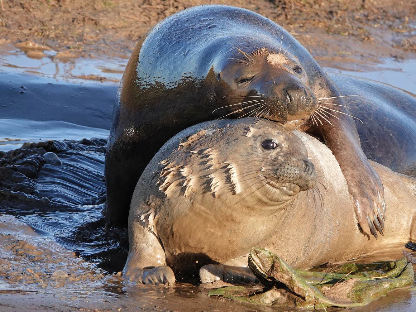 Мать-тюлененок обнимает своего детеныша перед тем, как он самостоятельно выйдет в море в Донна-Нук, на побережье Линкольншира, Великобритания. (Фото Paul Biggs):