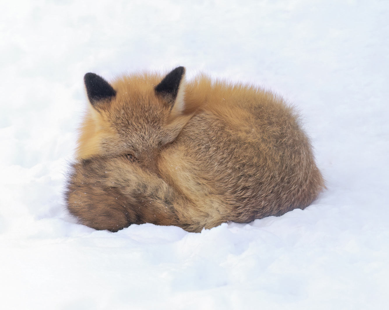 Рыжая лисица дремлет в Хейнсе, рядом с Аляскинским шоссе, после охоты. «Он лежал там, похожий на большой камень посреди снега», — сказал фотограф. (Фото Ina Schieferdecker):