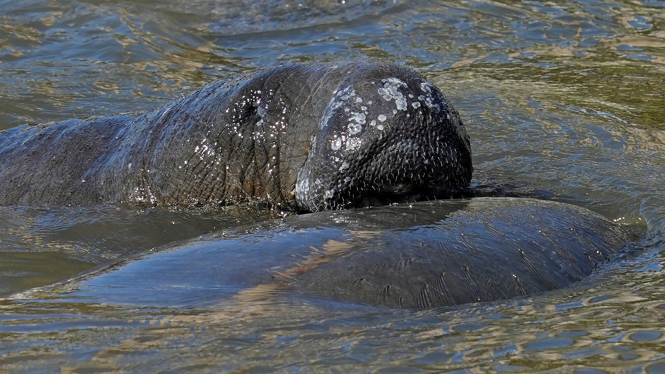 Ламантин кладет голову на спину другого ламантина на площадке компании Tampa Electric Company для наблюдения за ламантинами, Флорида. Теплая вода с электростанции сбрасывается в залив, привлекая нежных морских существ. (Фото Chris O’Meara):