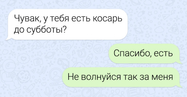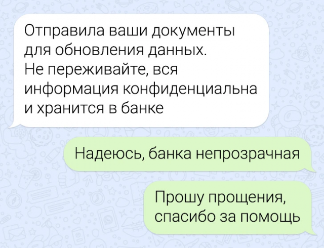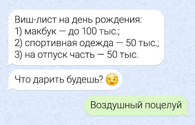Новая порция забавных переписок 14/02/2025 23:30 Давненько мы не радовали вас подборкой веселых сообщений, и пора это исправить! Смех продлевает жизнь, так что отвлекайтесь от забот, читайте, улыбайтесь и делитесь любимыми моментами с друзьями. Главная / Картинки +5 Admin 0 275