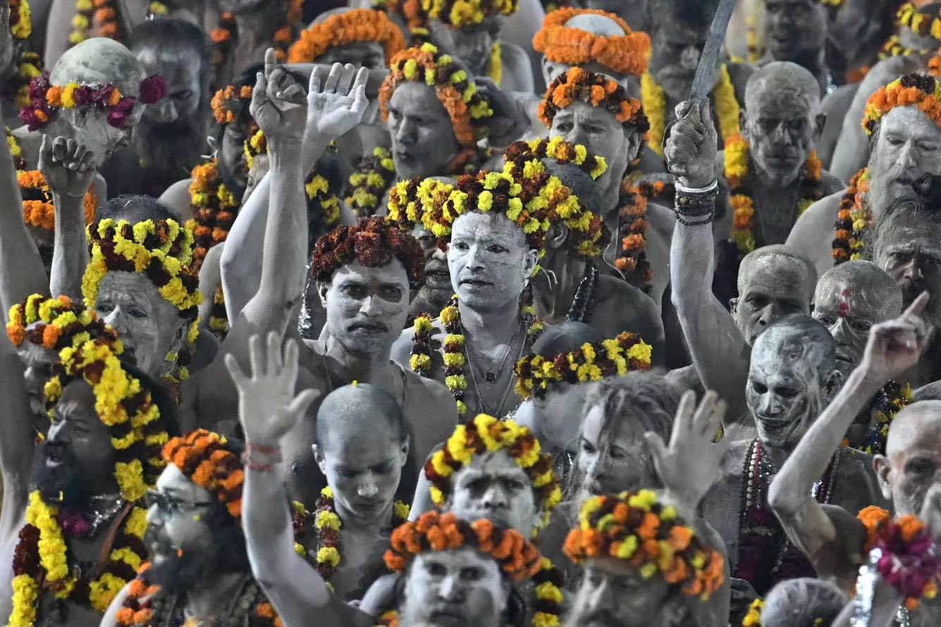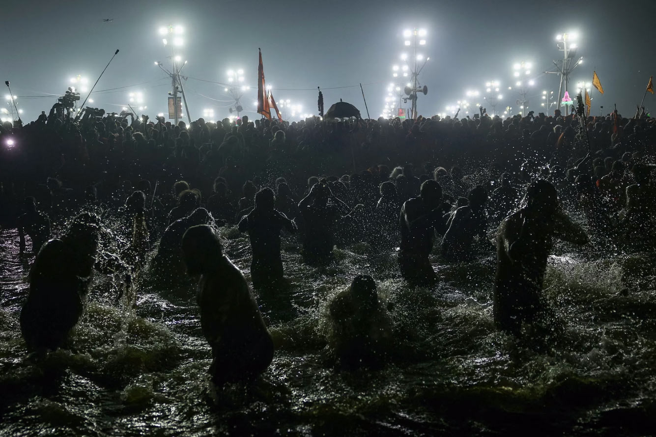 Садху окунаются в священные воды Сангама. Садху — термин, которым в индуизме и индийской культуре называют аскетов, святых и йогинов, более не стремящихся к осуществлению трёх целей жизни индуизма: камы (чувственных наслаждений), артхи (материального развития) и даже дхармы (долга). (Фото Niharika Kulkarni):