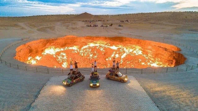 Это газовый кратер, который непрерывно горит с 1971 года. Его диаметр составляет 60 метров, а глубина 20.