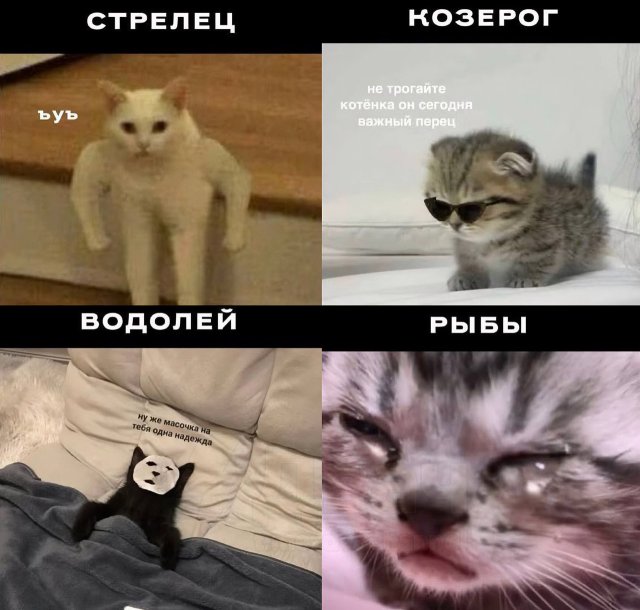 Астрологи снова радуют необычными исследованиями! На этот раз они определили, какой мемный кот соответствует каждому знаку зодиака. Судя по всему, их наблюдения действительно попали в точку. Готовы узнать, кто вы — угрюмый Грамп-Кэт или веселый Нян-кот?