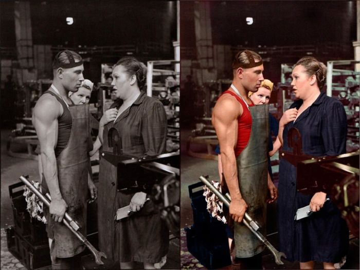 В общем, зачем что-то придумывать? Перед нами просто классный снимок. Рабочий и начальница, скорее всего, знают, что на заводе сейчас работает фотограф из-за границы и немного взволнованы, поэтому и ведут себя странновато. Кто ж знал, что пройдет 70 лет и люди будут обсуждать их и их отношения – не важно, было что или нет.