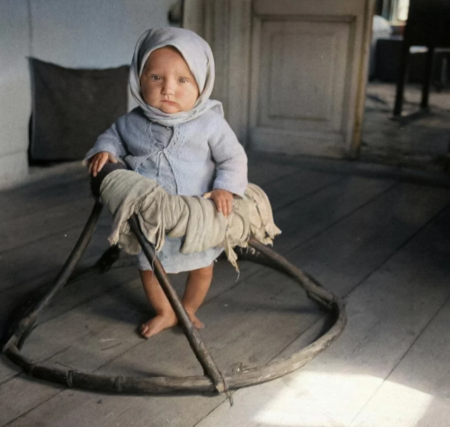 Ребенок учится ходить с помощью плетеных ходунков, 1942 год.