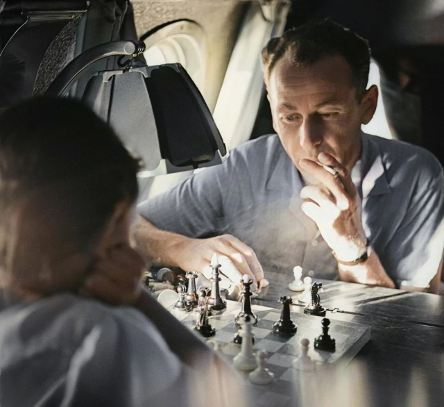 Первый советский реактивный пассажирский самолёт "ТУ-104" выполняет первый регулярный рейс по маршруту Москва - Омск - Иркутск. Пассажиры на борту самолета играют в шахматы, 1956 год.