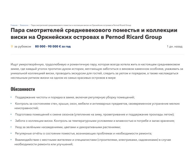 В Шотландии ищут пару для работы в историческом замке на Оркнейских островах, где вам предстоит следить за элитной коллекцией виски. Заработная плата составит 680 000 рублей, а на дегустацию виски можно будет ходить без ограничений. Уникальная возможность для любителей виски!