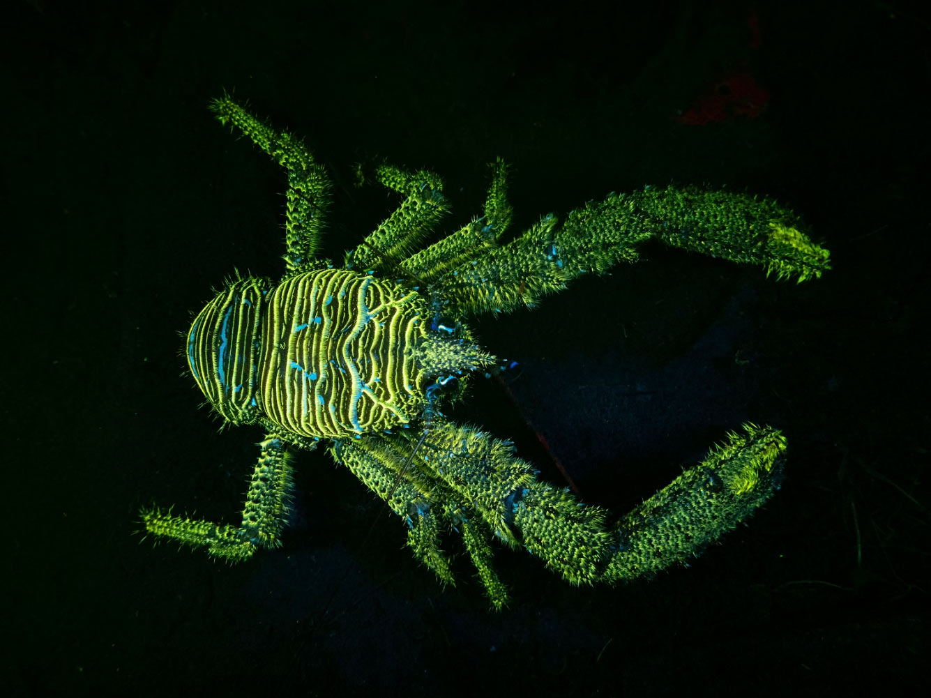 «Этот снимок был сделан во время чудесного ночного погружения в Инверари, Лох-Файн. Это место известно тем, что на небольшой глубине водится множество красивых анемонов-фейерверков, но здесь также есть старая труба, покрытая бетонными блоками, которая является домом для множества живых существ, включая колючего омаров. Этих омаров обычно можно найти висящими вниз головой на валунах и выступах и исчезающими в тот момент, когда нажимается затвор камеры. Однако во время этого ночного погружения они бродили на открытом воздухе и, похоже, не возражали против того, чтобы их сфотографировали. Эти омары демонстрируют самую яркую флуоресценцию, которую я видел у ракообразных, и я был очень рад, что во время этого погружения мне удалось запечатлеть все животное в кадре». (Фото © James Lynott / UPY2025):