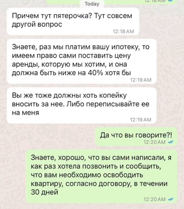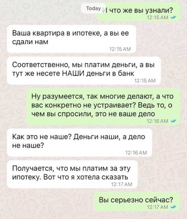 В социальных сетях активно обсуждают неожиданный разговор между арендатором квартиры и её владельцем. Арендаторы предъявили претензию, утверждая, что их средства идут на погашение ипотеки. «По их мнению, раз они платят за жилье, оно должно стать их собственностью. Они предложили владельцу либо делиться деньгами от аренды, либо передать квартиру в их собственность», — пишут пользователи.