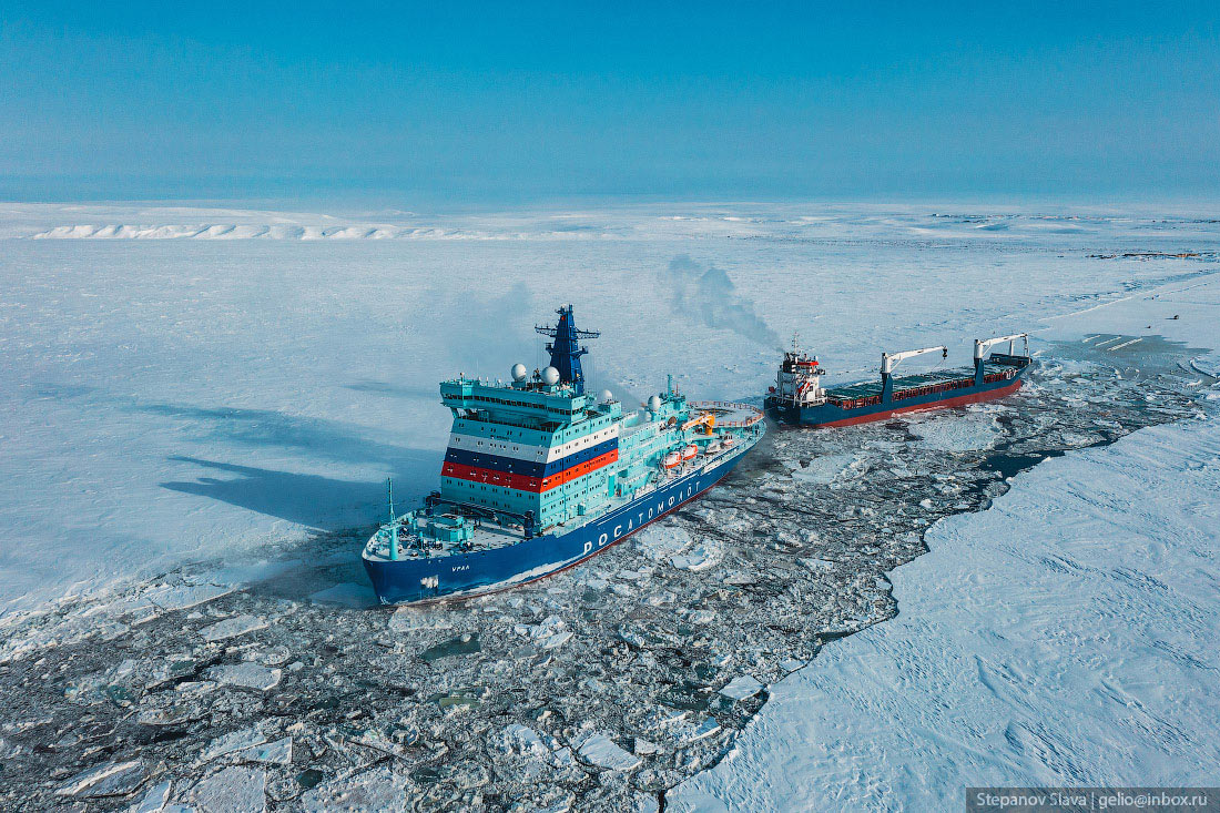 10. После судно пришвартовывается к ледоколу, и тот выходит из ледового причала, выводя загруженный теплоход в канал для разворота. Затем атомоход подходит своей кормой к корме проводимого судна, самым малым ходом выводит теплоход из ледового причала в разворотный канал, чтобы далее выполнить проводку судна к следующему месту назначения.