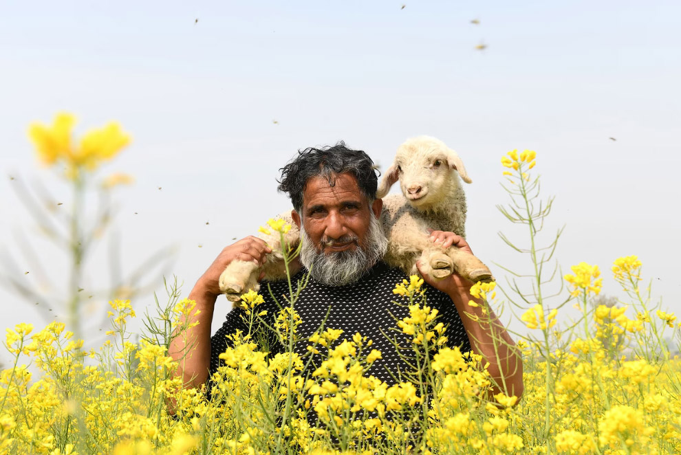 Пастух несет ягненка на плечах, идя по горчичному полю в районе Пулвама в Южном Кашмире, 8 апреля 2025 года. (Фото Басит Заргар):