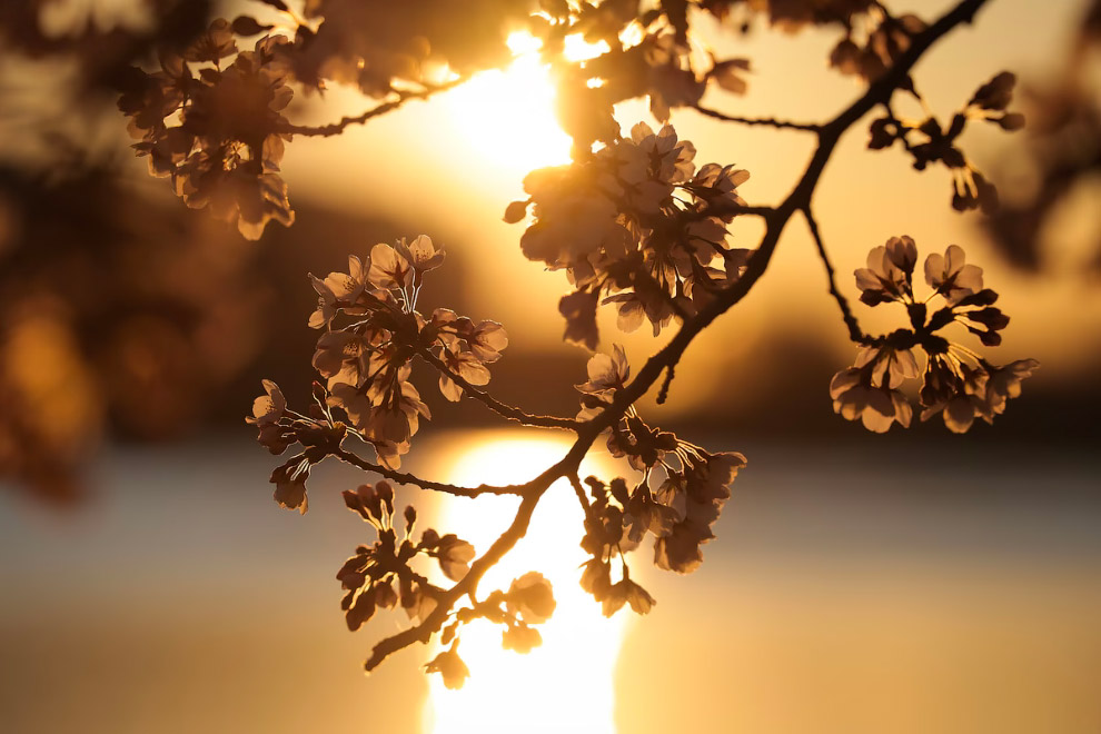 Солнце встает над цветущей вишней в Вашингтоне, округ Колумбия, 27 марта 2025. (Фото Кайла Бартковски):