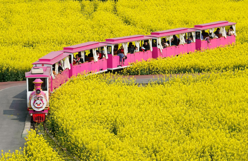 Экскурсионный поезд едет по красочным полям цветов в Аньшуне, провинция Гуйчжоу, Китай. (Фото Цинь Ган):