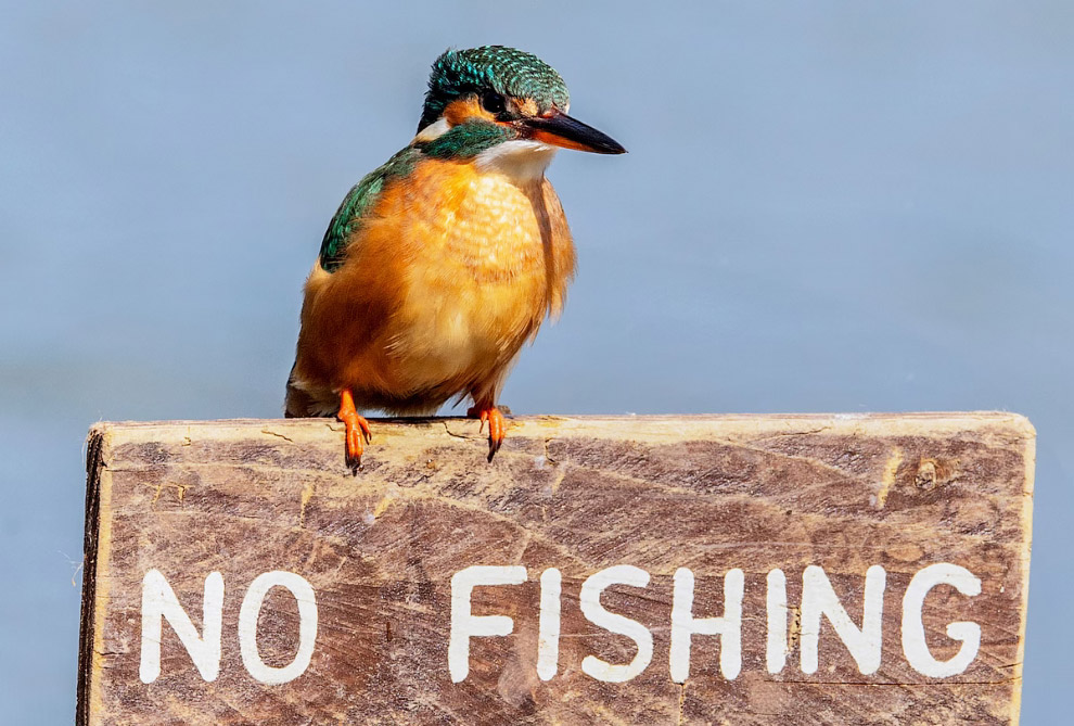 Зимородок сидит на знаке «Рыбалка запрещена» и готовится нырнуть за рыбой в парке Теддесли солнечным весенним днем в Стаффордшире, Англия, 5 апреля 2025 года. (Фото Стюарт Брок):