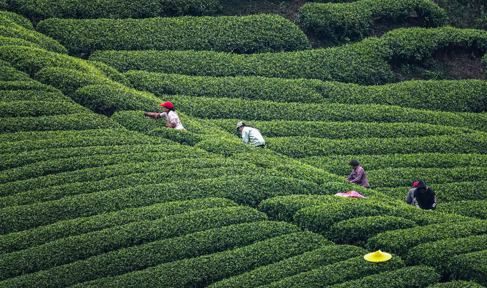Фермеры собирают чайные листья на чайной плантации 5 апреля 2025 года в Хэчжоу, Гуанси-Чжуанский автономный район, Китай. (Фото Юй Сянцюань):